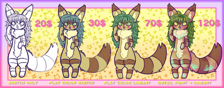 (I will email you with the update once I've begun drawing your commission).-I will work on commissions in the order they are received. I cannot guarantee your commission will be done by the date you prefer, but please let me know if you have a preferred date and I will take it into consideration.-I reserve the right to charge more for characters, poses, patterns, objects and all potential features I deem complex or time consuming in nature. I do not appreciate haggling and I will not accept your commission if you attempt to argue with my pricing.-I cannot change major details such as characters, posing, objects, etc. after I've received your consent to begin linework and/or coloring.-I can adjust colors and filters as needed on regular shaded pieces as well as flat color pieces at any time during the coloring process. For paintings I need requests for color changes earlier in the process, after I've received your consent to move forward with chosen colors, I can only make slight adjustments.-I will need your consent to move forward with steps of the commission process, please try to get back to me as quickly as possible. If days go by and I receive no reply, I will be forced to make an executive decision myself and I will be unable to make certain changes after certain steps in the process as previously mentioned.-In your email you must list all relevant details including